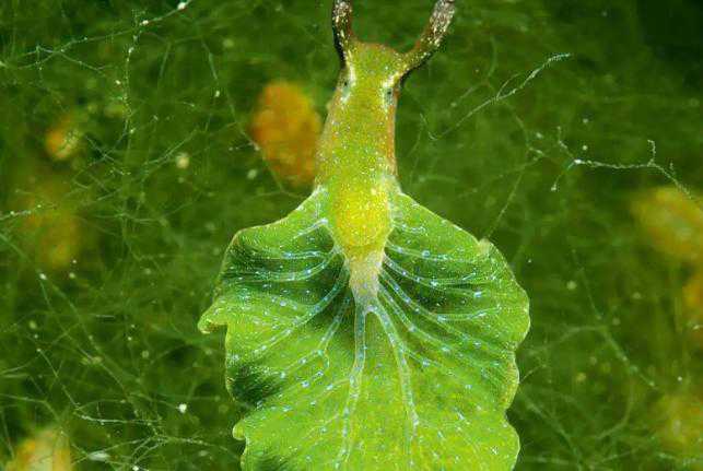 特别是在世界上还有一种动物,就以一种特别独特的方式去利用阳光,那就是绿叶海天牛。是最有代表性的一种动物,长得就是像一片绿叶的海蛞蝓可以再吃进去的藻类植物中获取一些叶绿素,并存在自己的身体中。通过这些叶绿素再去进行光合作用,不用去进行捕食就能够获得能量。