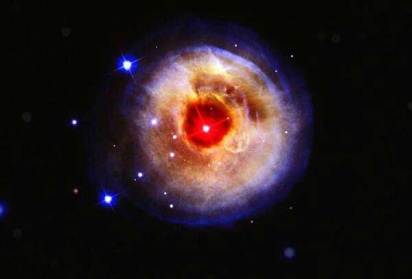 麒麟座v838是一颗位于麒麟座的红色变星,它距离太阳约2万光年,最新测得其平均直径为太阳的390倍(曾爆炸将恒星表层扩大,直径变为太阳的1700倍)。如上图所示,就是麒麟座v838变星,中央红色核心才是恒星本身,周围结构是被照亮的尘埃云。