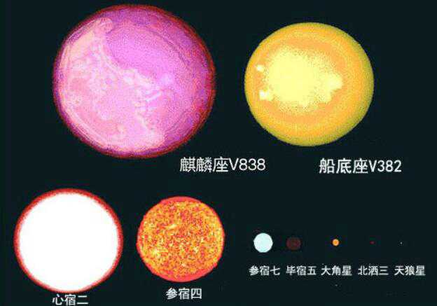 在银河系十大恒星中,参宿四因为大而上榜,它的直径约太阳的887-955倍,体积约为太阳的7-8.7亿倍。而麒麟座v838变星直径最新为太阳的390倍,所以麒麟座v838变星和参宿四哪个大?显然是参宿四更大(但在麒麟掌v838变星最大时期,它比参宿四更大)。