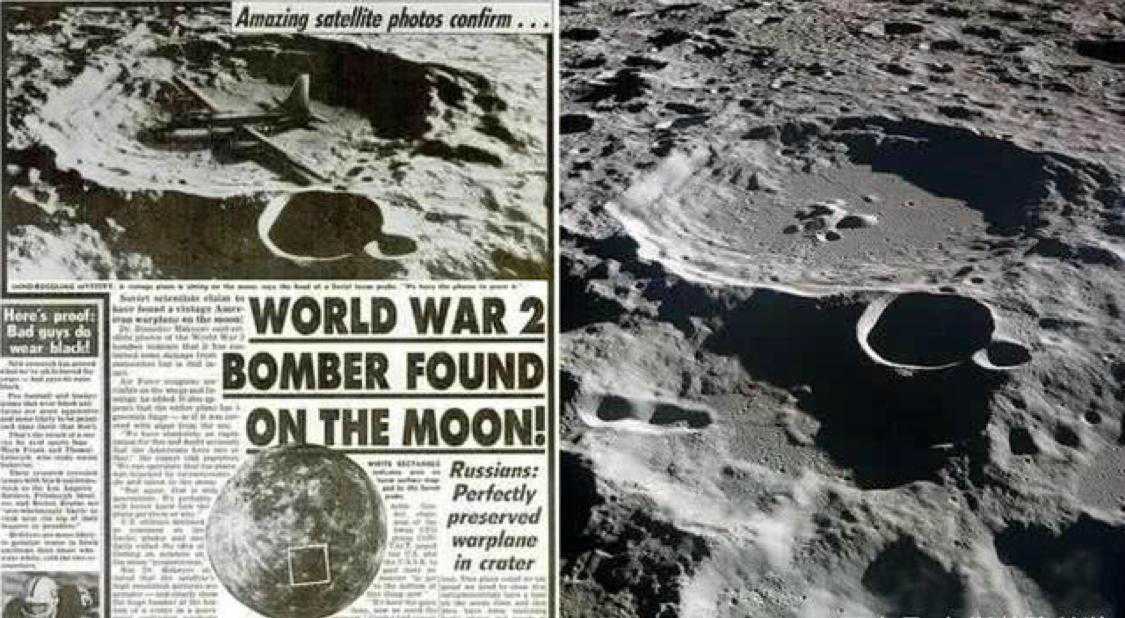 月球背面发现了飞机。 然而发回的传真照片显示,一架二战时期的老式美国轰炸机停在月球陨石坑的边缘,机身机翼上有醒目的美国空军标志。