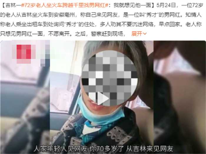 5月24日一位72岁老人从吉林乘坐火车来到安徽蒙城的新闻在网络上获得了不少的点击,据了解这名 老人是想见一位男网友,她到处询问当地人这位男网友的住处,却并不清楚他的真实身份,而是只知道一个“秀才”的称呼。
