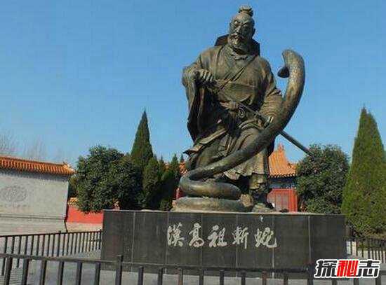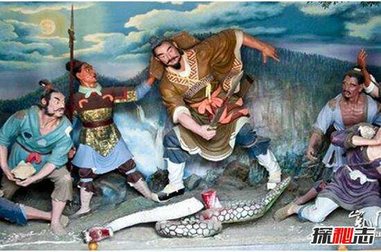 路上遇到一条白蛇挡道,刘邦上前一剑把白蛇斩为两段。刘邦斩白蛇过后,第二天早上,有人经过斩蛇之处,看见一个老妇人痛哭不已。问她为什么哭,老妇人说:“我儿子是白帝之子,他被赤帝之子杀了。”老妇人说完,不见了踪影。刘邦听到这件事之后内心大喜,认为自己就是赤帝之子,更加坚定了反秦的决心。后来,果然灭亡秦朝,建立了汉朝。