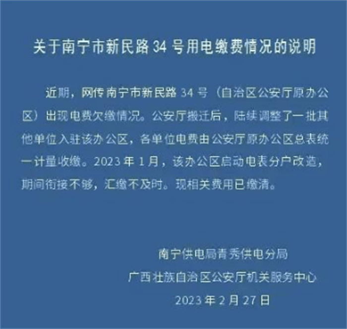 公安厅在这之后回应公安厅的办公区域已经做出搬迁。随后也是进入到了一些其他的办公单位。只不过这些办公单位的用电量全部都收归到了公安厅一起计算,难怪会欠下了40多万元。不过南宁公安厅公布现在欠款以及利息已经在2月27日的晚上全部交纳清楚。