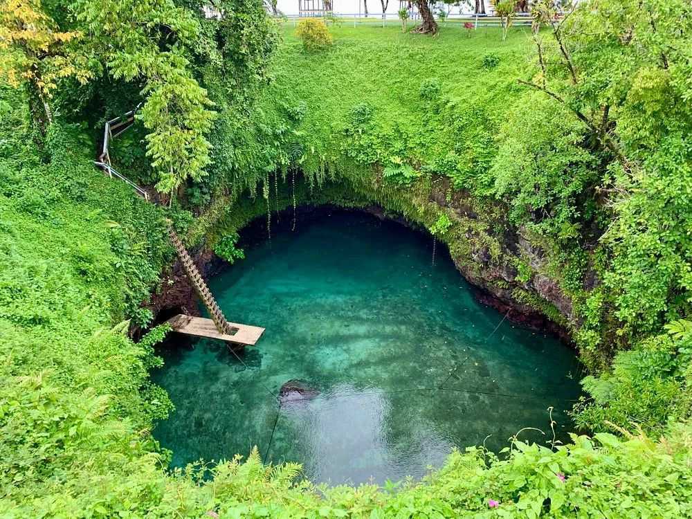 在萨摩亚语之中翻译过来也被称作是巨大的洞沟,是属于地下的岩浆,以及地表清澈的海水共同所导致形成的一处地面下沉的坑洞,由于海水倒灌过之后才形成了苏阿海沟,平常都是被一些茂密的丛林和藤蔓所遮掩住,但如果从上往下去看,则是能够看出一个来自于地下30米深左右的海坑,折射出碧玉一般的光芒,有一个木质的梯子与海沟连接,只要顺着梯子就能到达海面,十分的清澈。