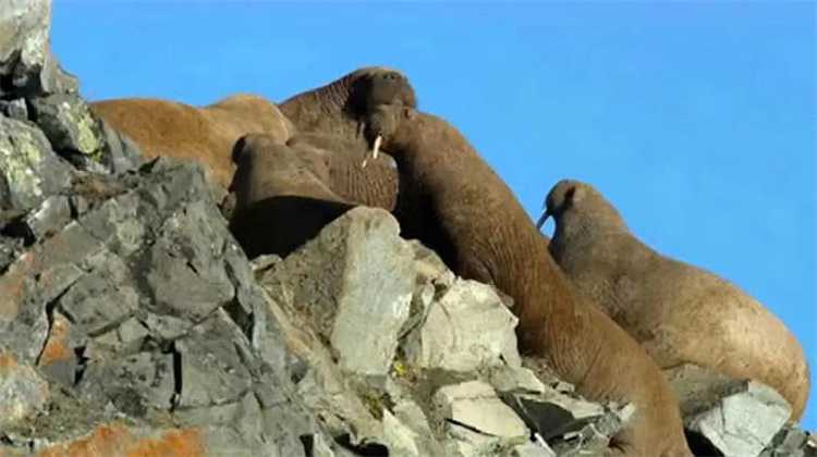 纪录片《我们的星球》中拍摄了俄罗斯北部的一个海岸,这里的海象在不断的攀爬峭壁,仅仅在拍摄的这段时间内,就有250头海象走向80米陡峭悬崖,然后再集体从峭壁上跌落自杀。原来海象的生存空间变得越来越小,为了获得更多的生存机会,它们才会铤而走险攀爬峭壁。