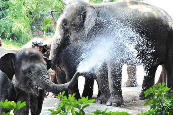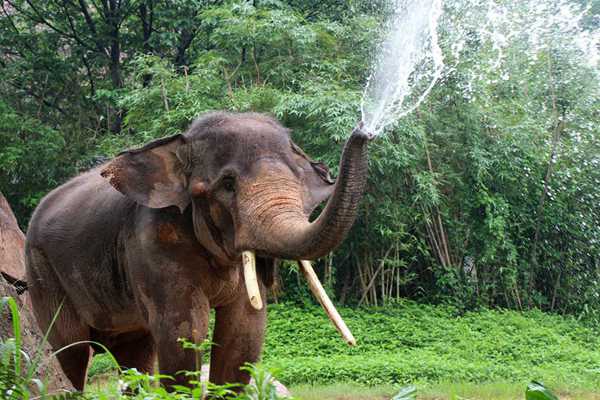 大象的鼻子的前段有一块软骨,就像个阀门一样,能够很好的将水吸入而不被呛到,所以大象喝水和洗澡都是利用鼻子的吸水功能,将水喂到嘴边,或喷到身上。